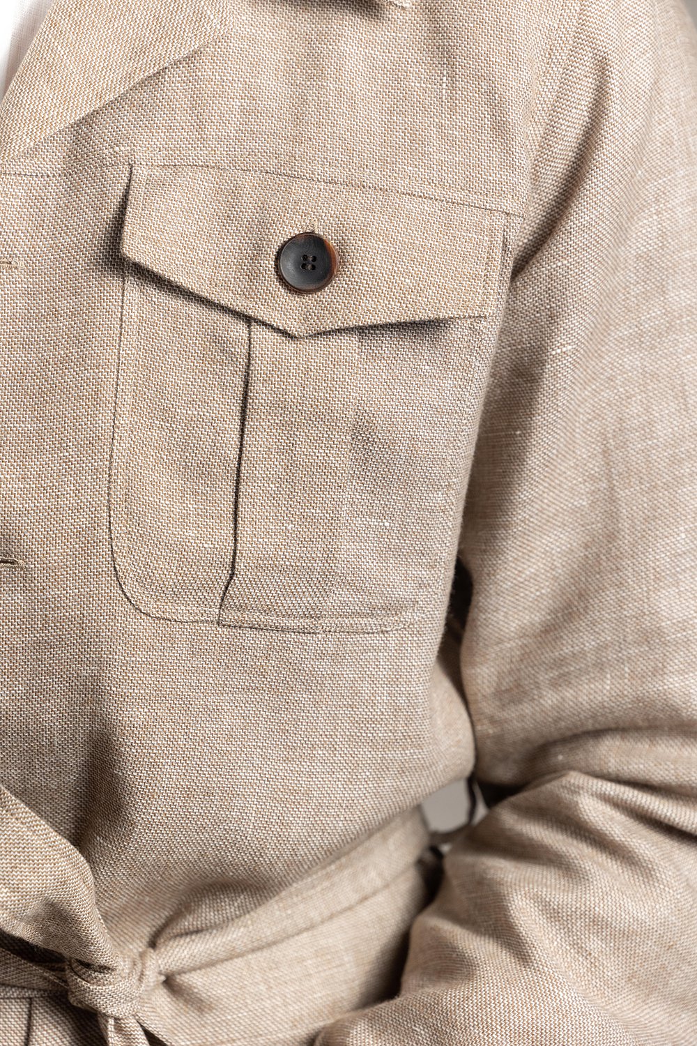 Kurtka wykonana została z beżowego, przewiewnego materiału – mieszanki wełny i lnu.