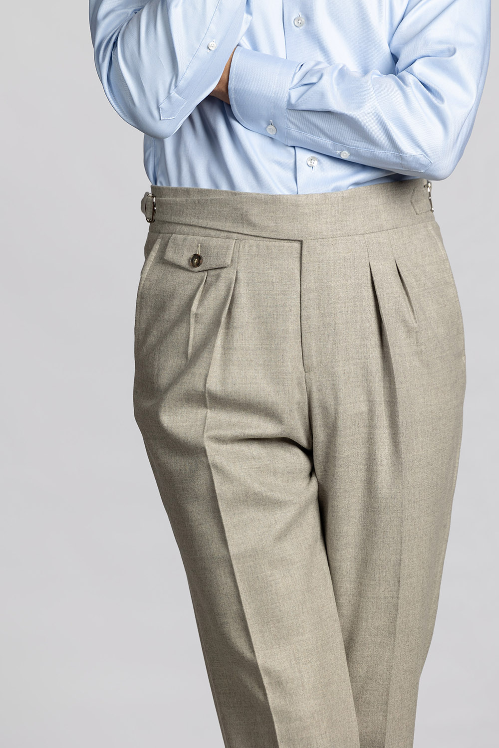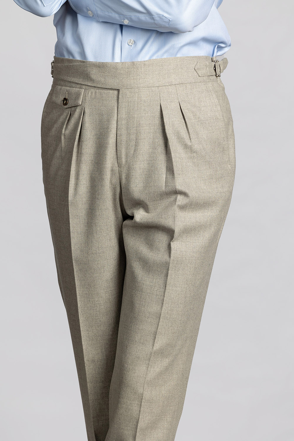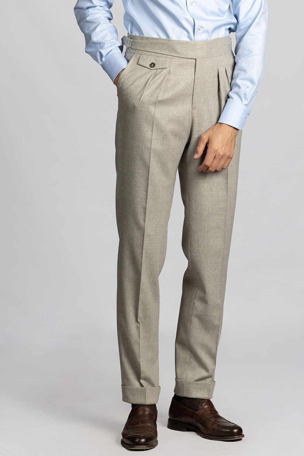 Beżowe spodnie z wysokiej jakości wełnianej flaneli od włoskiej tkalni Guabello. Gramatura tkaniny to 285/295 g/m. Tkanina posiada naturalny strecz i wykończenie Soft Touch dzięki czemu spodnie są niesamowicie wygodne i przyjemne w noszeniu.