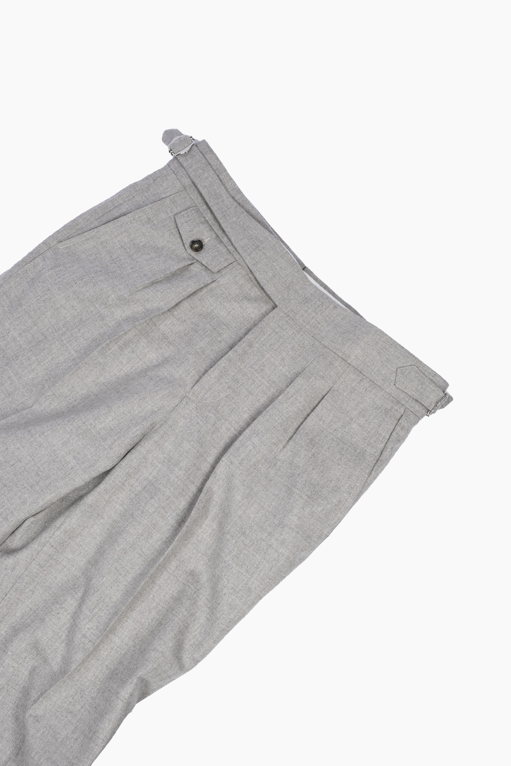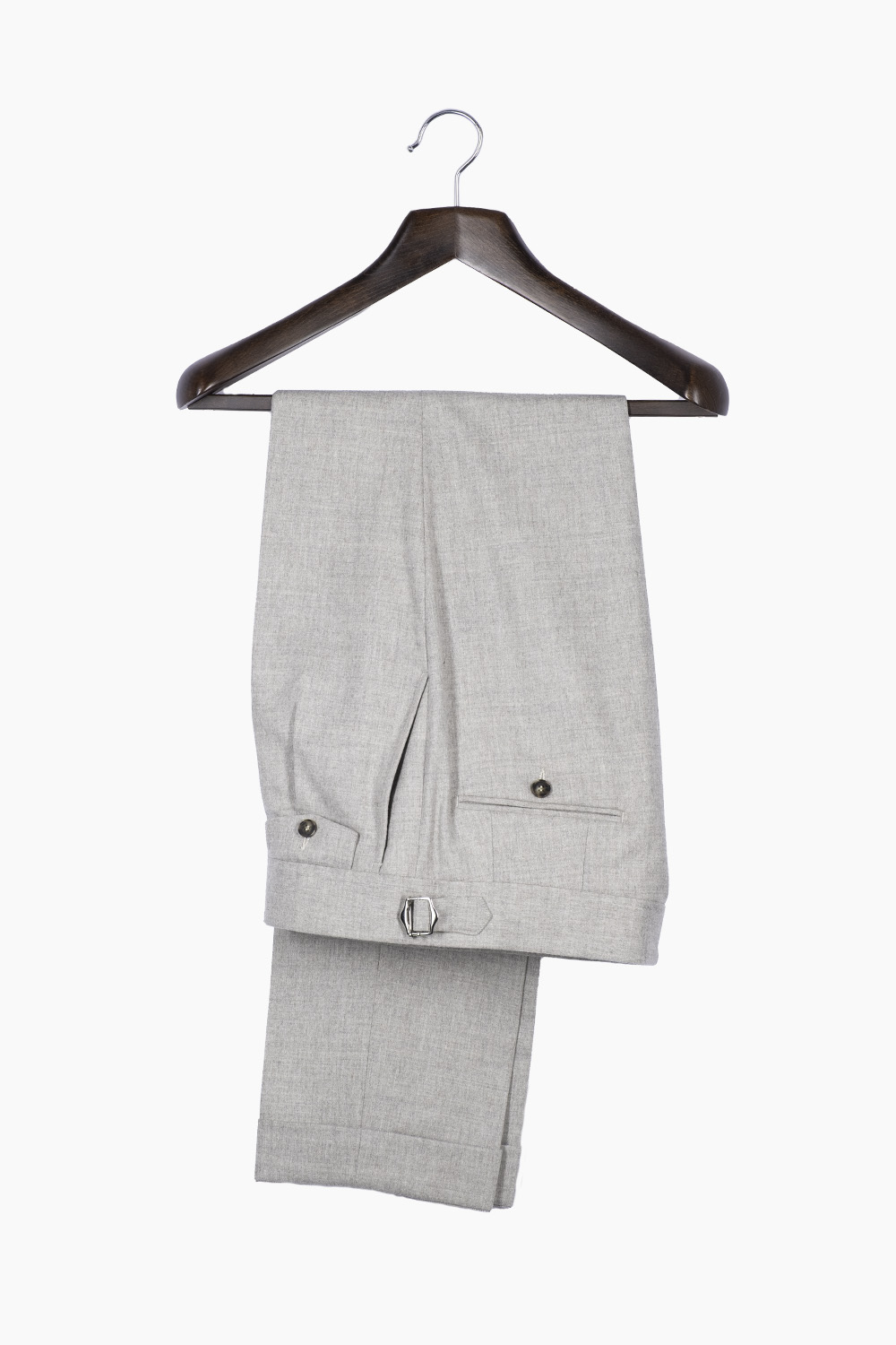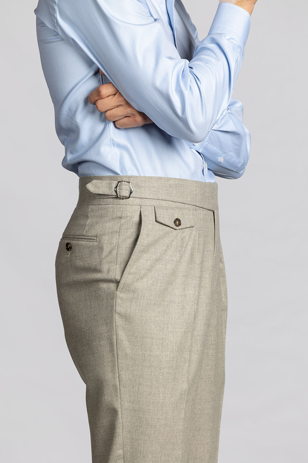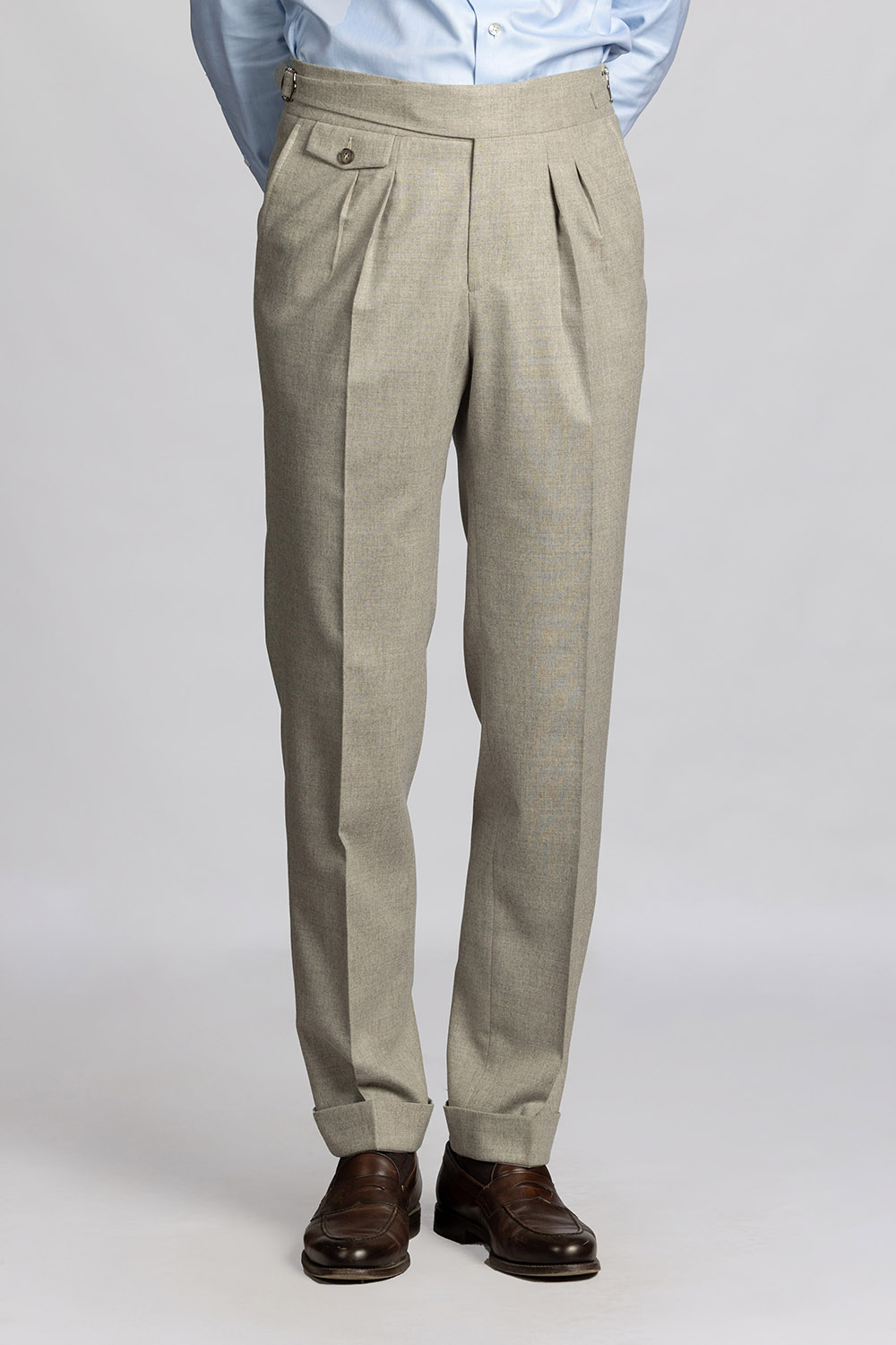 Beżowe spodnie z wysokiej jakości wełnianej flaneli od włoskiej tkalni Guabello. Gramatura tkaniny to 285/295 g/m. Tkanina posiada naturalny strecz i wykończenie Soft Touch dzięki czemu spodnie są niesamowicie wygodne i przyjemne w noszeniu.