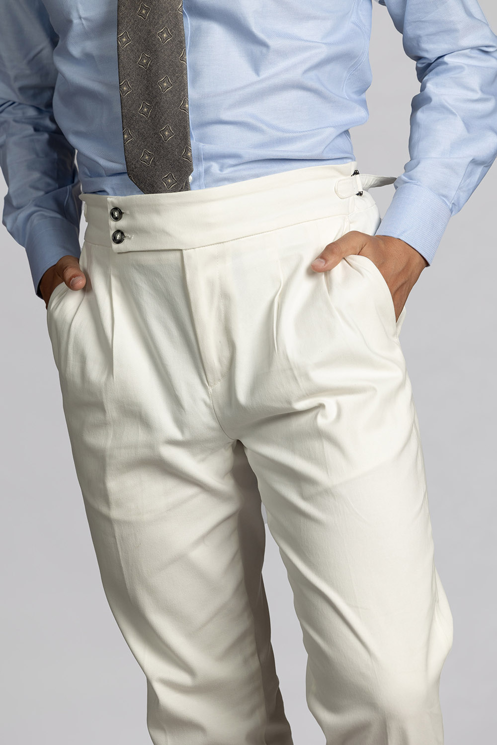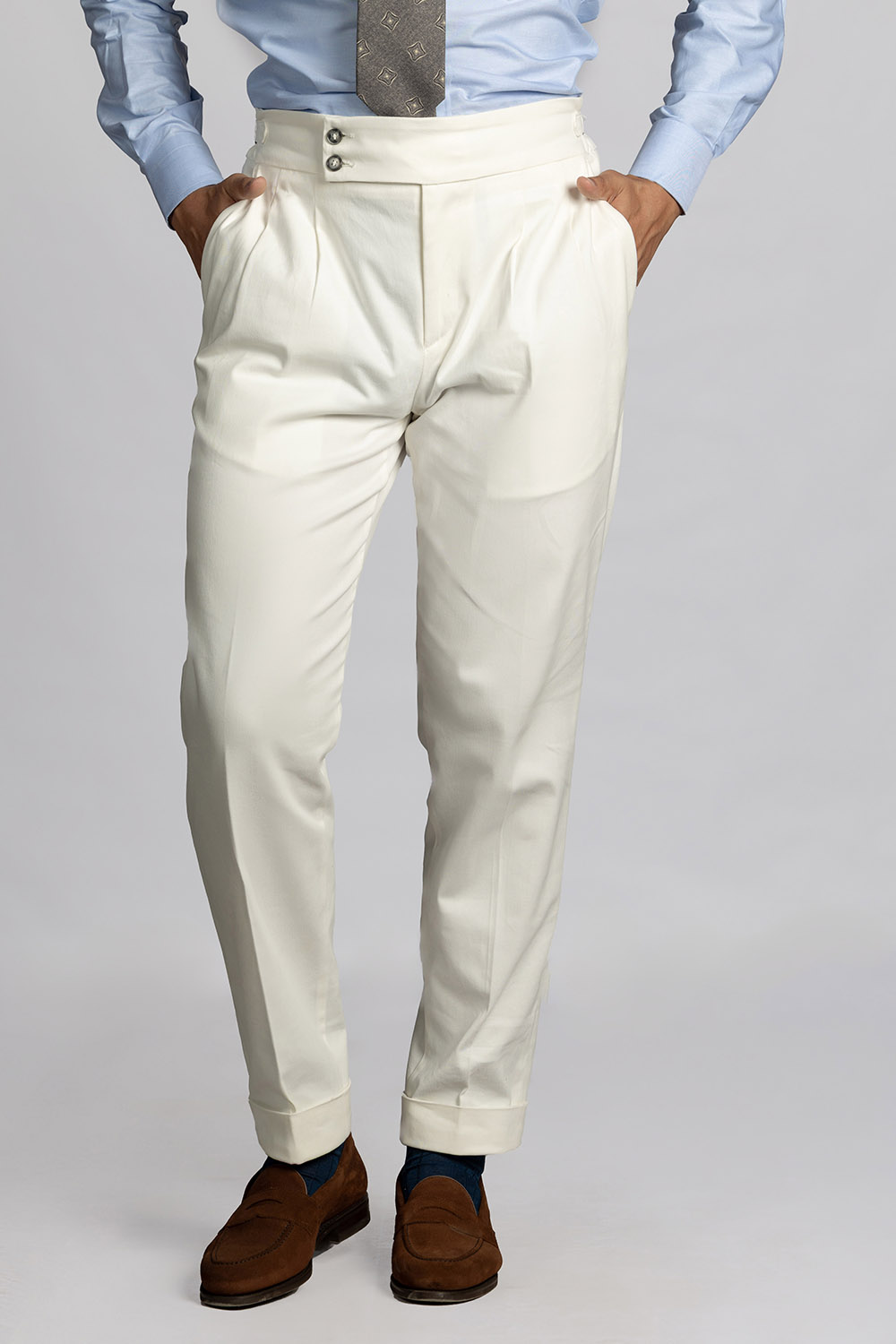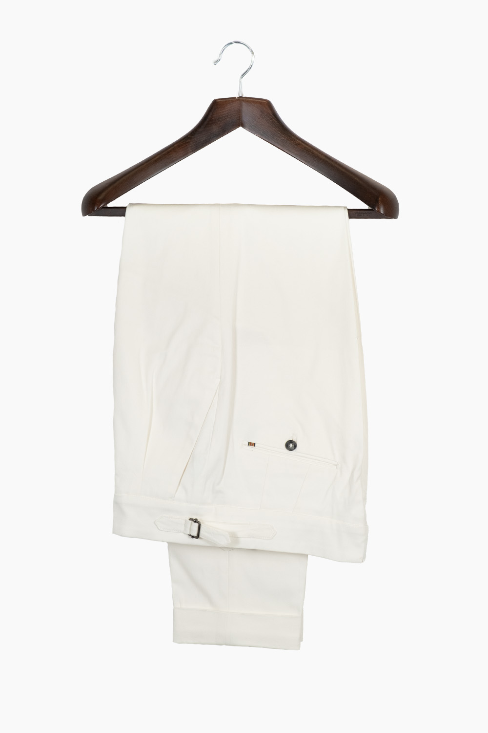 Białe spodnie z wysokim stanem i dwoma zakładkami. Bawełna ma matowe wykończenie, wyraźną strukturę i wyjątkową miękkość. Spodnie są lekkie i wygodne. Doskonale sprawdzą się w smart casualu łączone z marynarką i koszulą oraz w mniej formalnych zestawach z sweterkiem, golfem czy t-shirtem. Spodnie posiadają wysoki stan, dwie zakładki na przodzie, szlufki do paska i mankiety o wysokości 5cm. Spodnie w kroju regular.