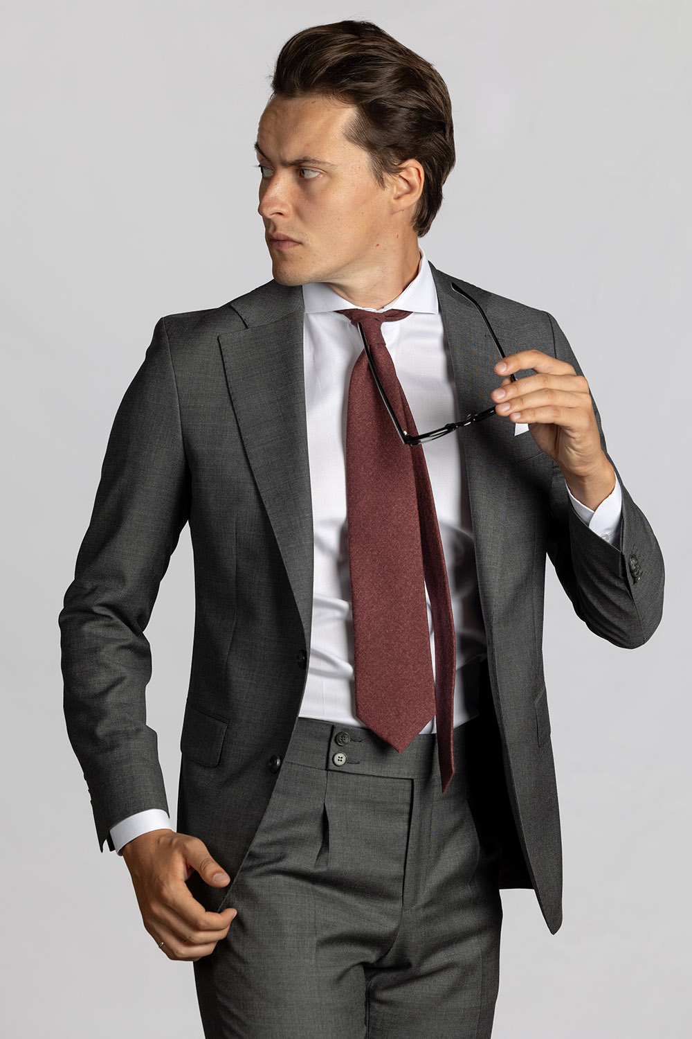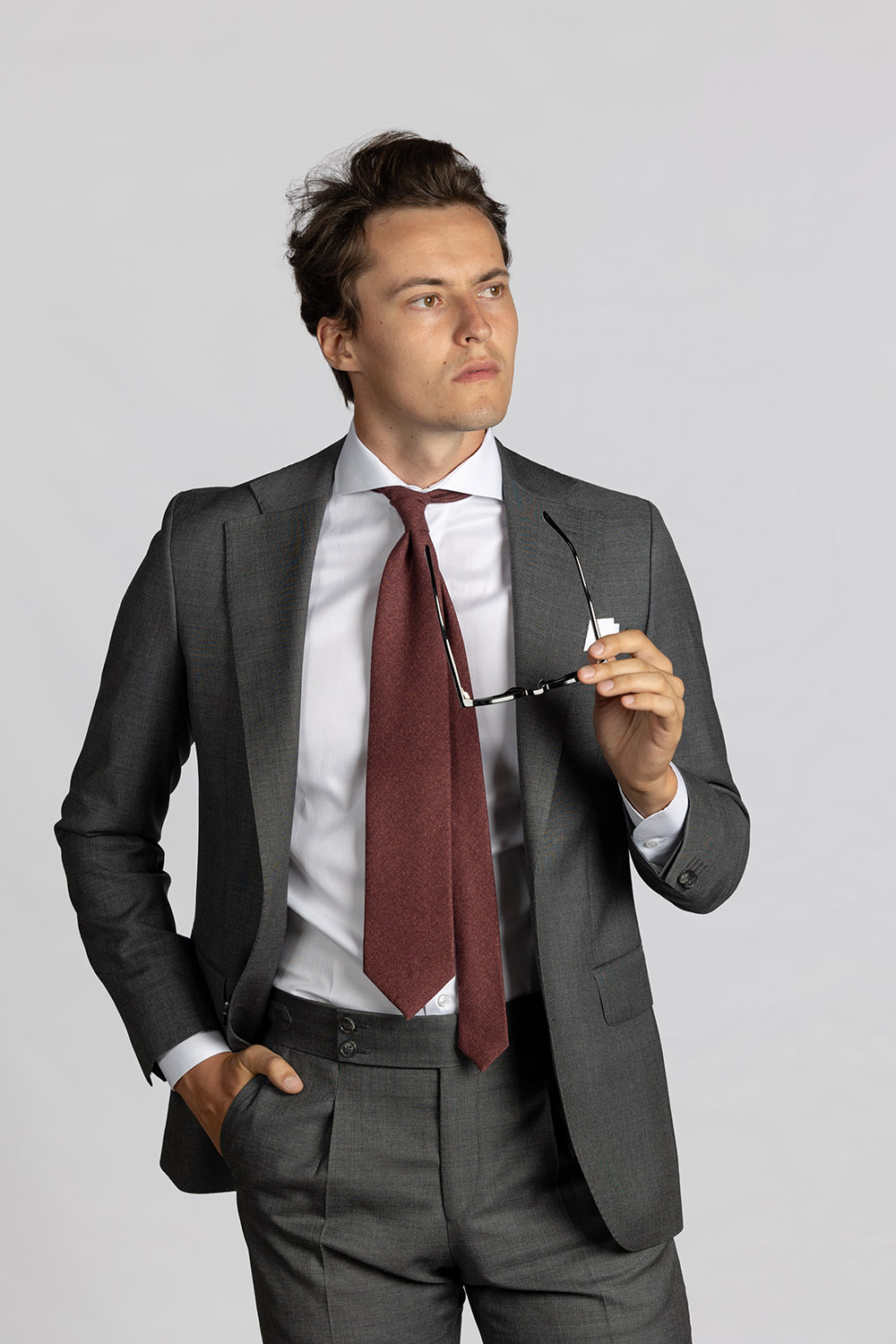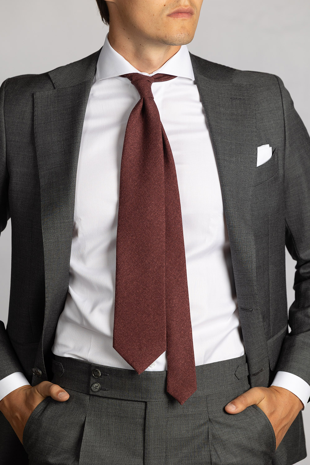 Bordowy wełniany krawat o szerokości 8,5 cm. Świetnie sprawdzi się w połączeniu z koszulami OCBD.