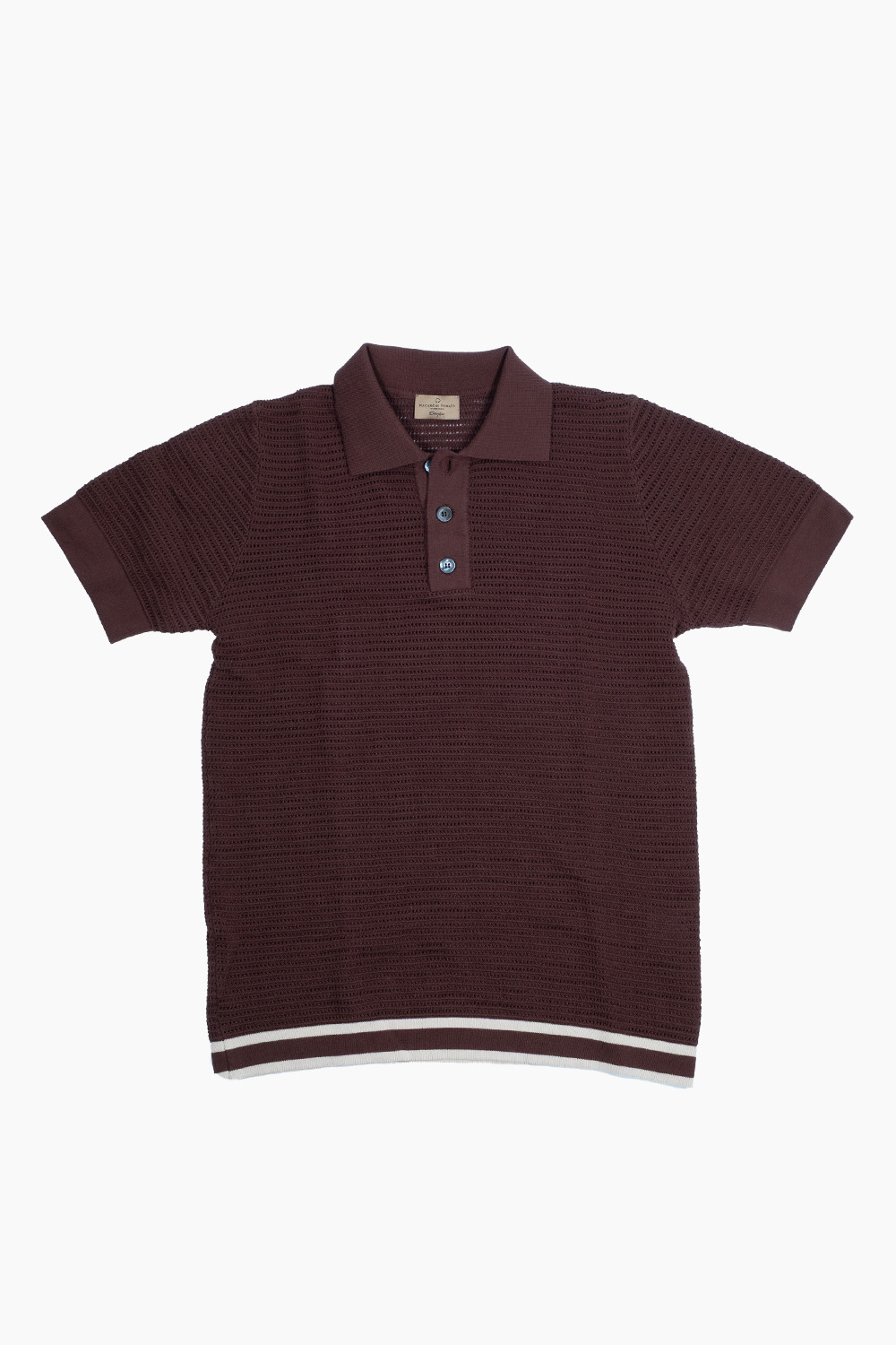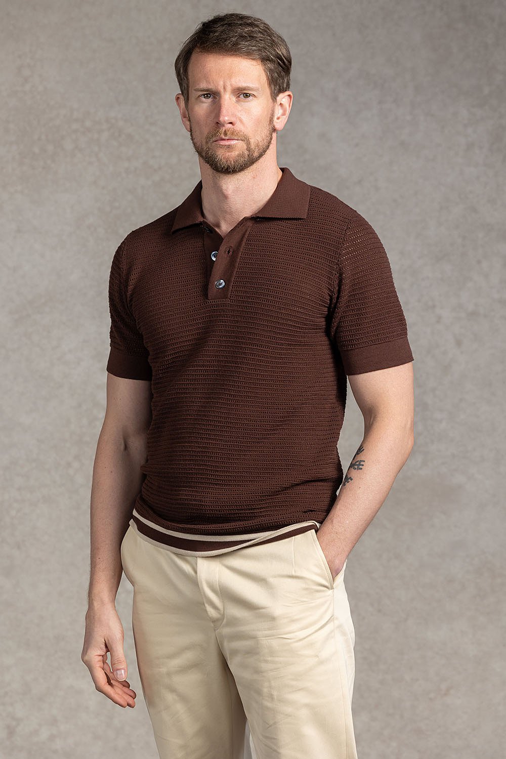 Brązowe polo z dzianiny. Wykonane z wysokiej jakości czesankowej bawełny o długich włóknach, od włoskiego producenta Marchi & Fildi. Dzianina świetna w chwycie, lekka i przewiewna. Zapewnia wysoki komfort użytkowania oraz dopasowania dzięki specjalnym szwom w ramionach. Wyprodukowane w Polsce w małej manufakturze. Polo o wyraźnej strukturze i luźnym ażurowym splocie. Polo posiada pasiasty detal na dolnym ściągaczu i na odwrocie ściągaczy na rękawkach.