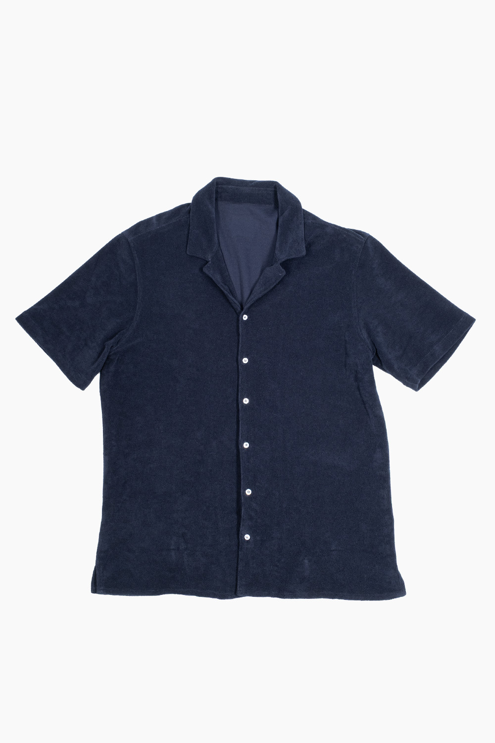 Granatowa koszula z krótkim rękawem wykonana bawełnianej tkaniny frotte. Tkanina to klasyka letniego casualu – bardzo miękka i wygodna.