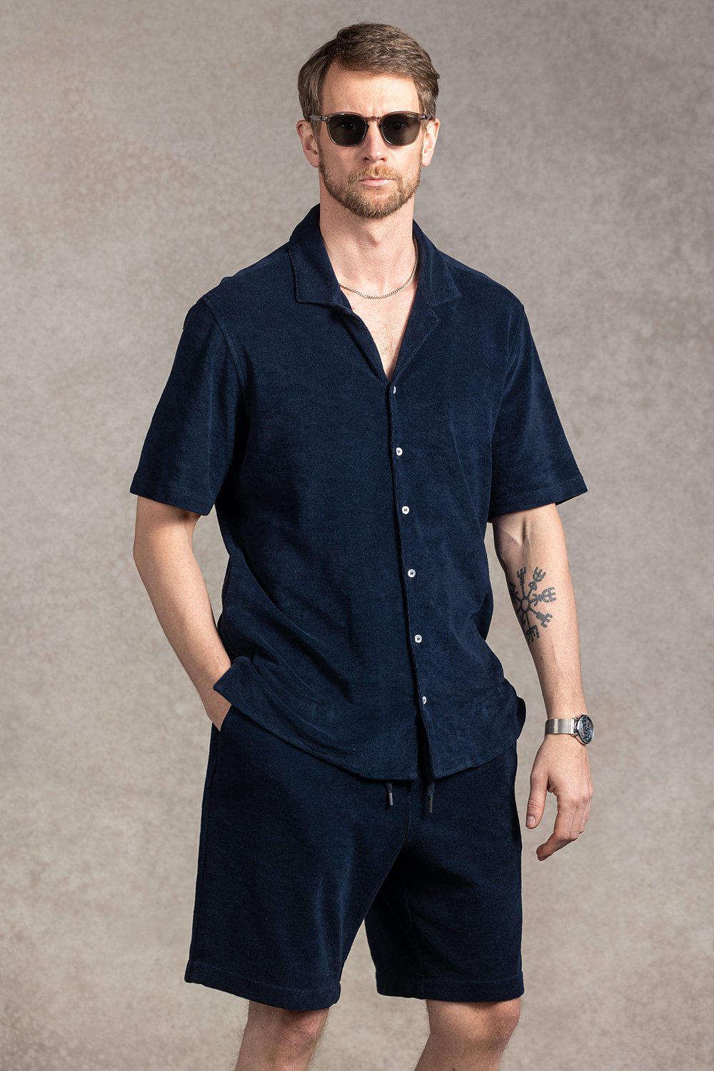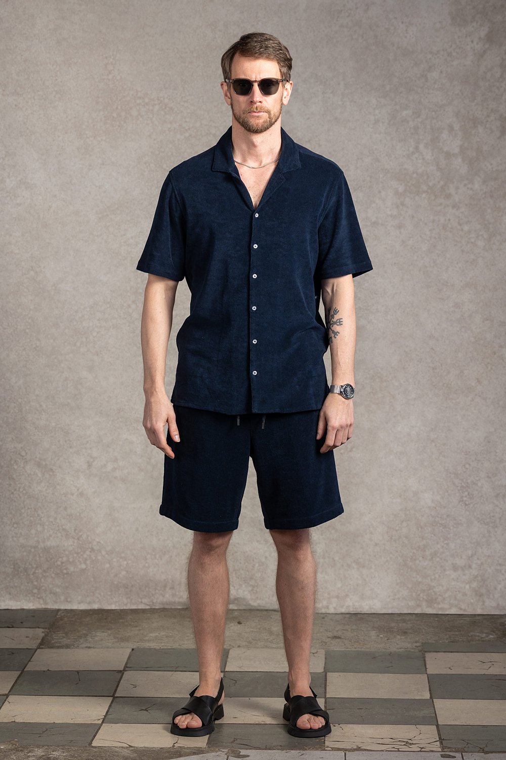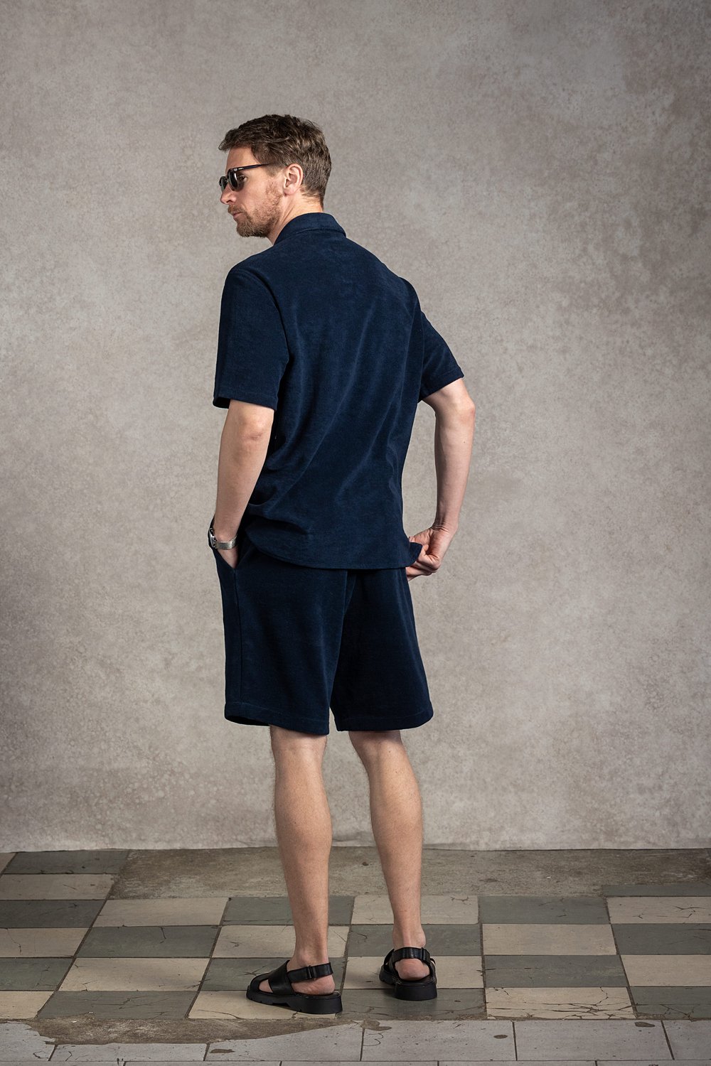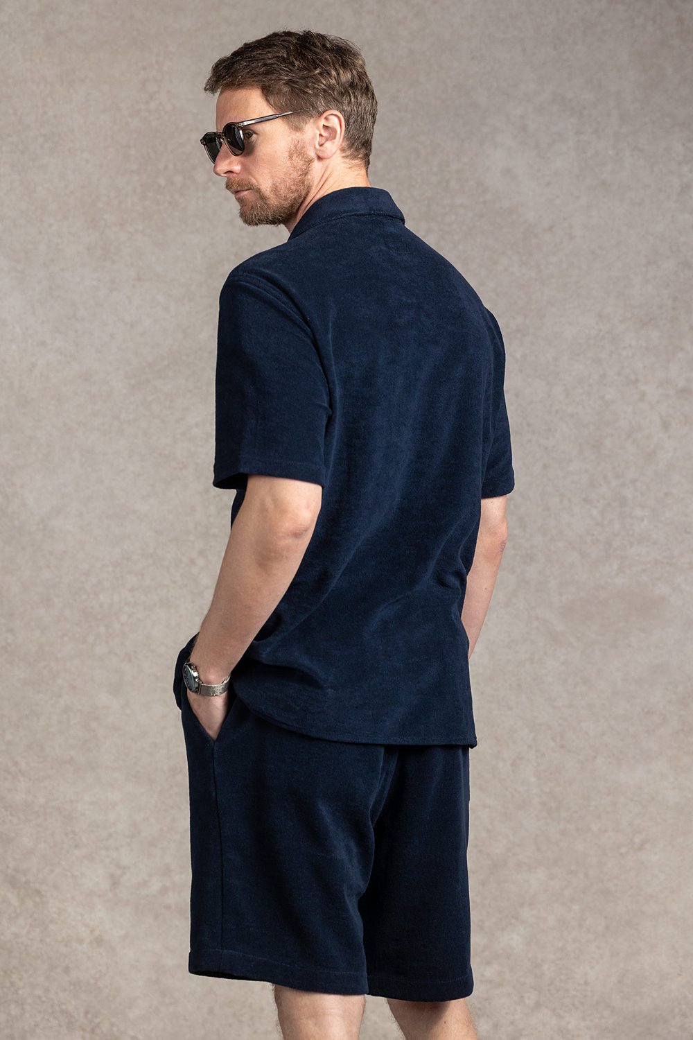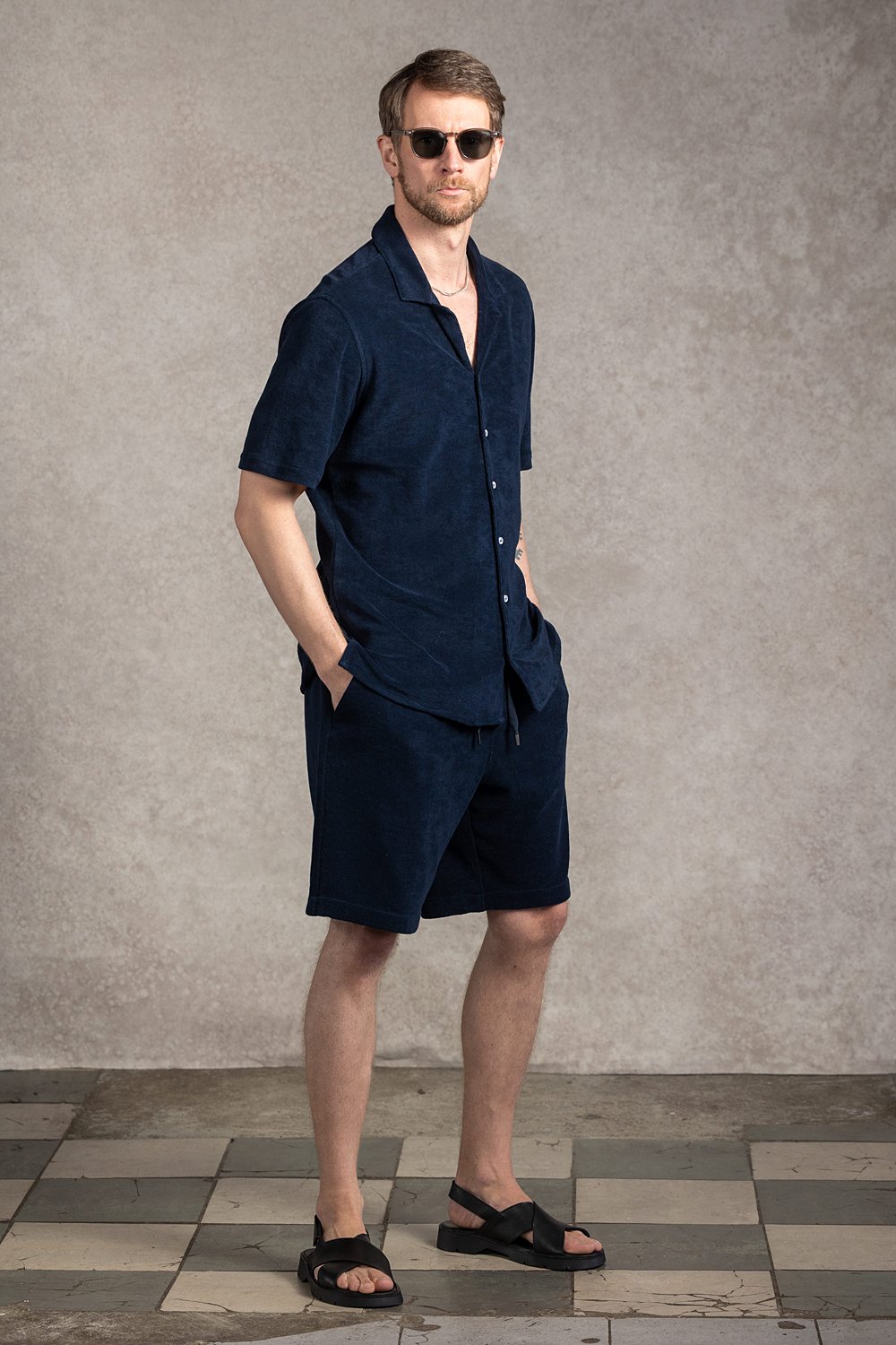 Casualowe spodenki w kolorze granatu o prostym kroju, wykonane bawełnianej tkaniny frotte. Tkanina to klasyka letniego casualu – bardzo miękka i wygodna.