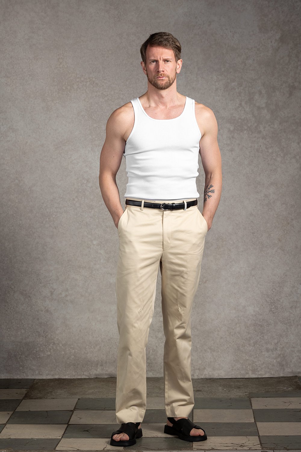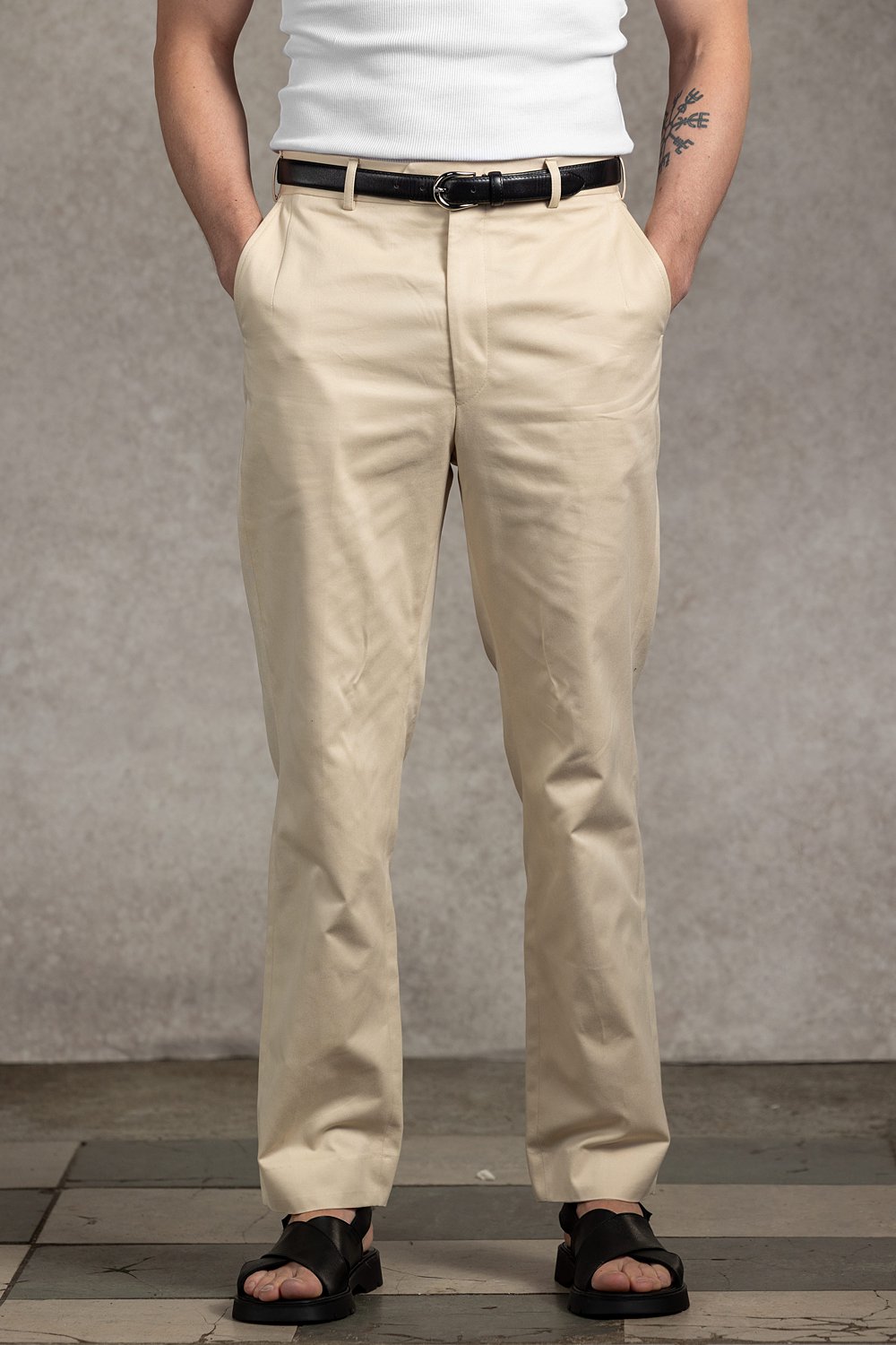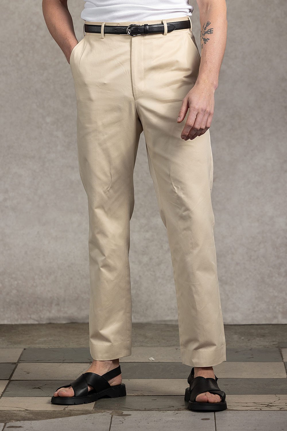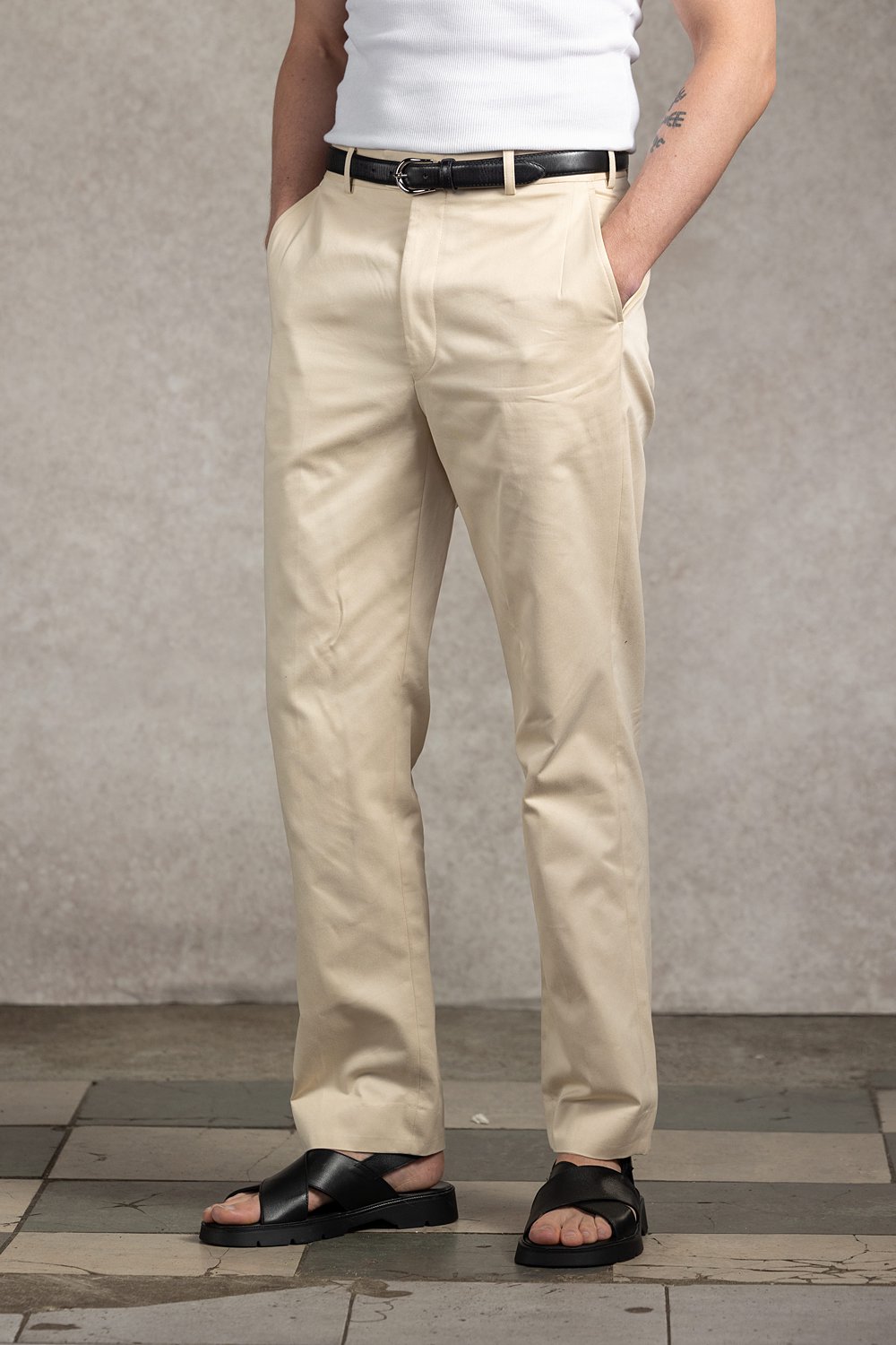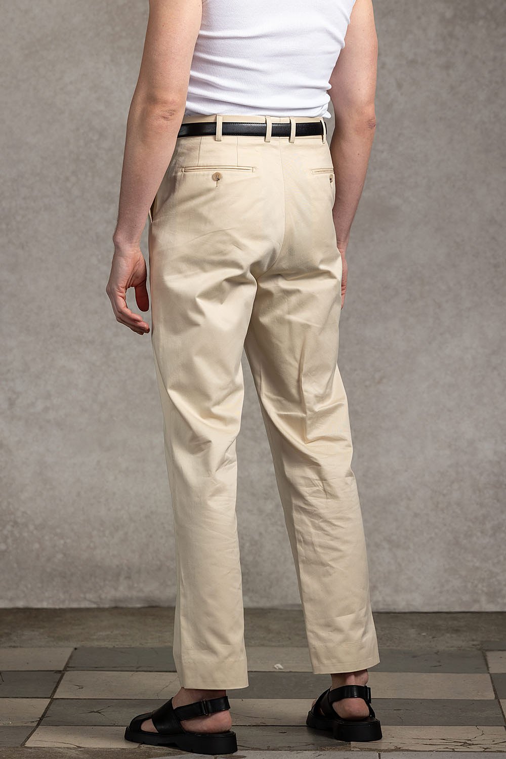 Kremowe spodnie z wysokim stanem i prostymi nogawkami. Bawełna ma matowe wykończenie, wyraźną strukturę i wyjątkową miękkość. Spodnie są lekkie i wygodne. Doskonale sprawdzą się w smart casualu łączone z marynarką i koszulą oraz w mniej formalnych zestawach z sweterkiem, golfem czy t-shirtem. Spodnie posiadają wysoki stan, szlufki do paska i prostą nogawkę. Spodnie w kroju regular – podkreślające wysoką talię.