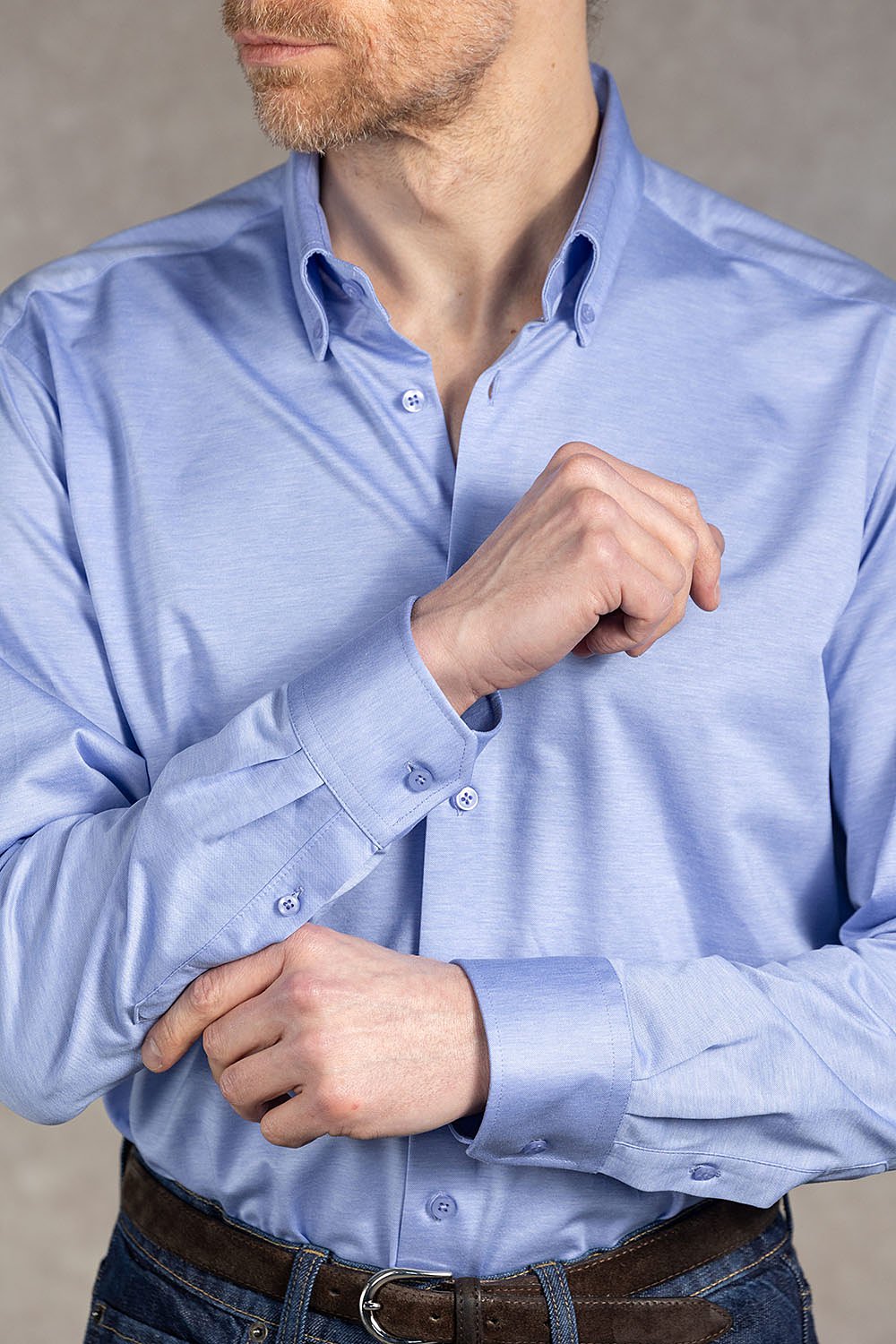 Niebieska koszula wykonana z elastycznej dzianiny z 100% bawełny łączy komfort typowy dla T-shirtu z elegancją klasycznej koszuli. Dzianinowa konstrukcja sprawia, że materiał naturalnie pracuje z ciałem, zapewniając swobodę ruchów i wysoki komfort noszenia przez cały dzień. Lekka, miękka i oddychająca tkanina dobrze sprawdza się zarówno w pracy, jak i w bardziej swobodnych stylizacjach.